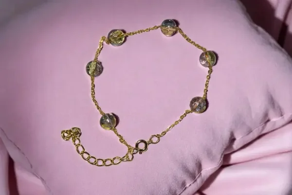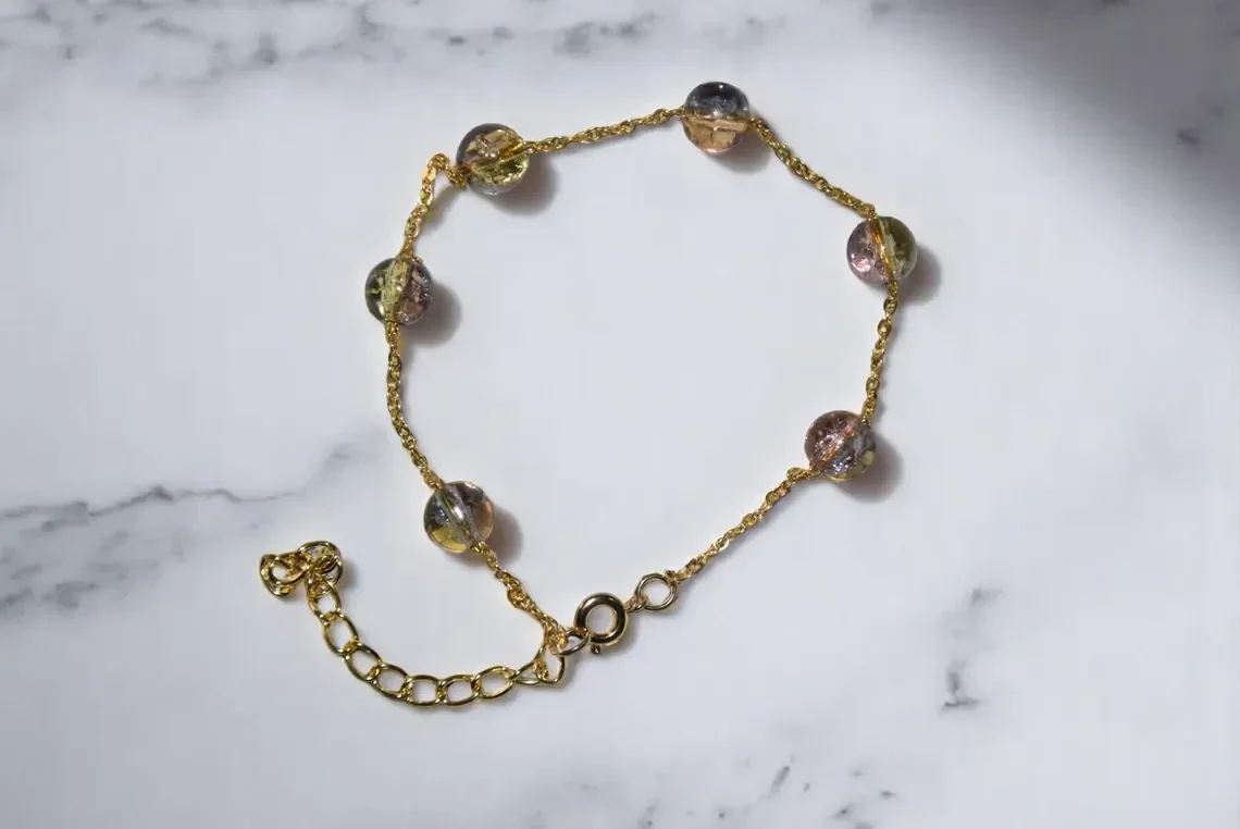 Les perles en verre qui composent ce bracelet sont soigneusement sélectionnées pour leur éclat et leur variété de couleurs. Elles apportent une touche de vivacité et de mystère, évoquant un sens de l'aventure et de la découverte. Chaque perle est un microcosme de textures et de reflets, capturant la lumière d'une manière unique qui change à chaque mouvement.