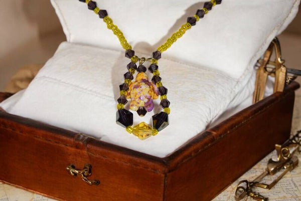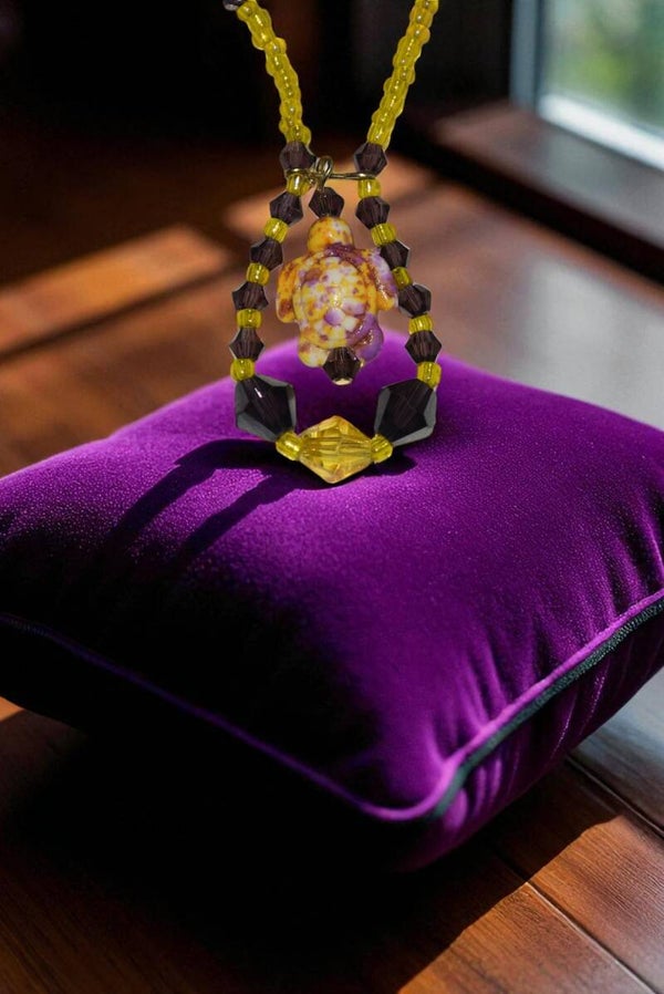 - Matériaux : Perles en cristal violettes, perles rocailles jaunes, tortue en pierre deux tons