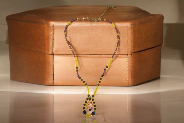 Description : Ce magnifique collier de 37 cm, agrémenté d'une extension de 5 cm, allie élégance et originalité. Il est composé de perles en cristal violettes, apportant une touche de sophistication, et de perles rocailles jaunes pour une note de couleur vive et chaleureuse. Une charmante tortue en pierre bicolore (deux tons) orne le bijou, ajoutant une touche symbolique et naturelle.
