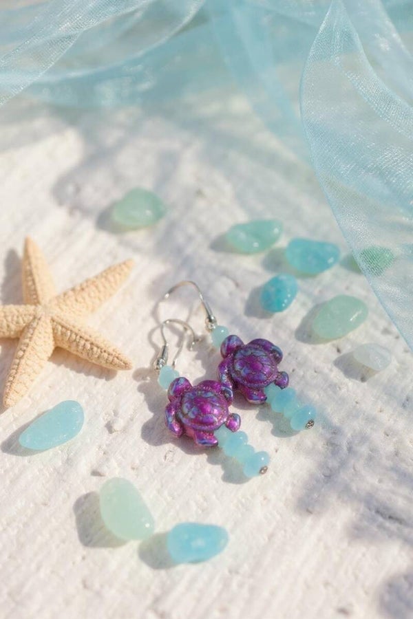 Boucles d'oreilles pendantes "Tortues", composées de perles en cristal bleues, de perles en verre bleues et de tortues en pierre 2 tons "violettes et bleues"