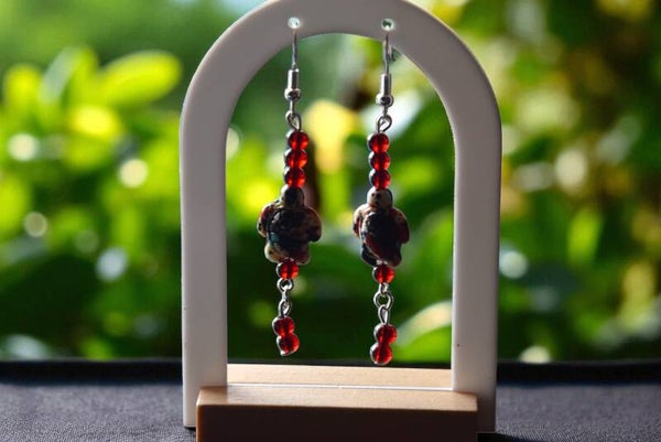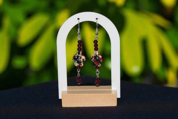 Boucles d'oreilles pendantes "Tortues", composées de perles en verre rouges et de tortues en pierre multicolores