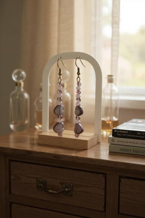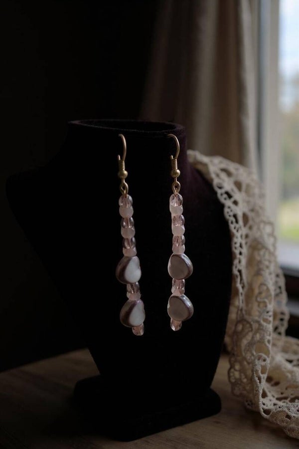 Boucles d'oreilles pendantes, composées de perles en nacre violettes et de perles en cristal roses et violettes. Acier inoxydable