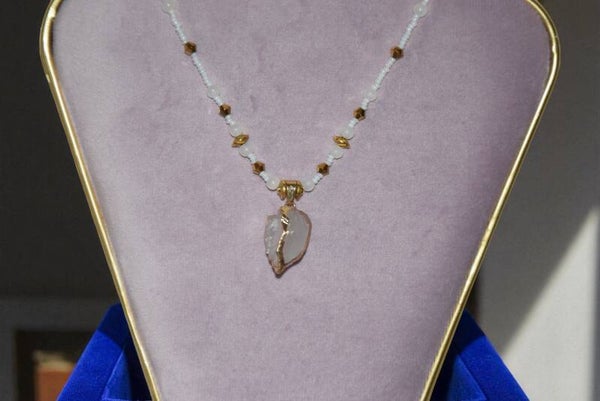 Collier 46 cm + extension composé de perles en cristal, oeil de chat, rocaille, métal et d'un pendentif en quartz blanc doré. Acier inoxydable