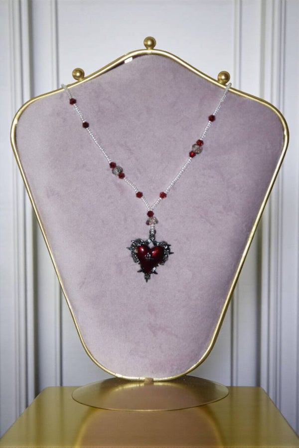 Collier 40 cm + extension 'Coeur sacré de Jésus' composé de perles de rocaille et cristal, en acier inoxydable