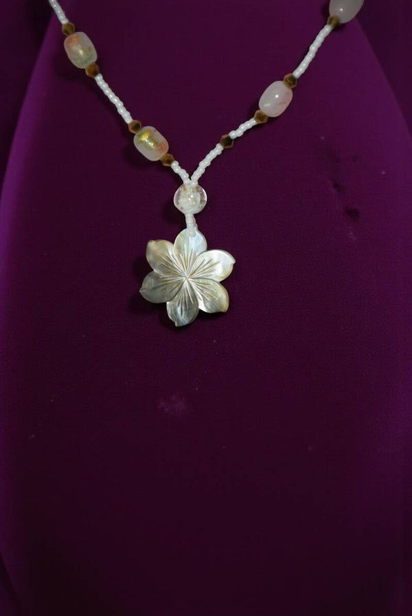 Collier 41 cm + extension "Fleur nacre" composé de perles de rocaille, verre et cristal. Pendentif fleur en nacre. Acier inoxydable