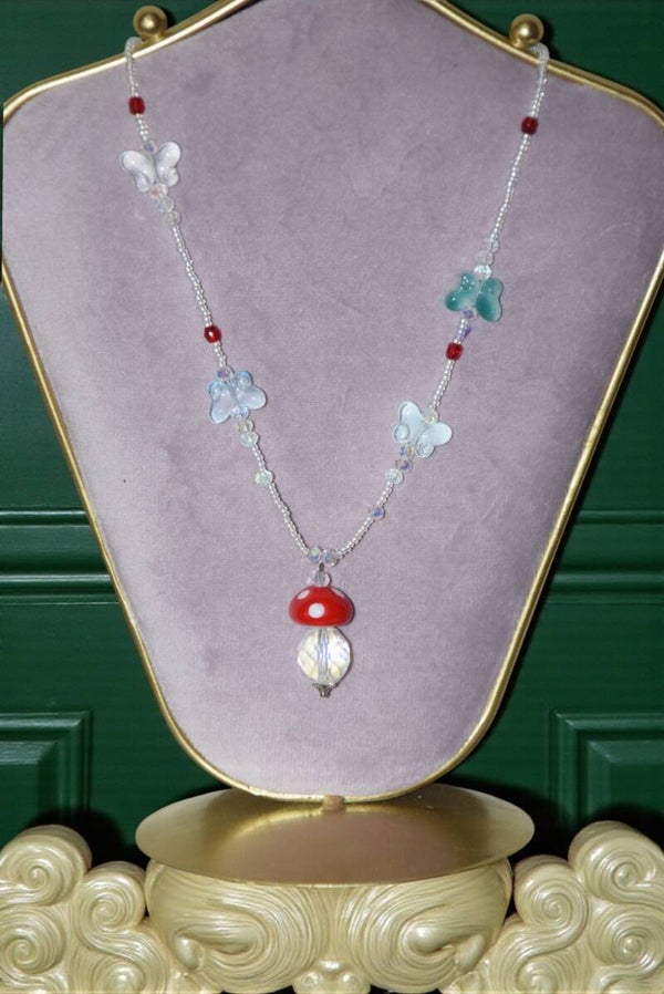 Collier 43 cm + extension "Champignon/Papillons" composé de perles de rocaille, verre et cristal. Pendentif champignon en verre. Acier inoxydable