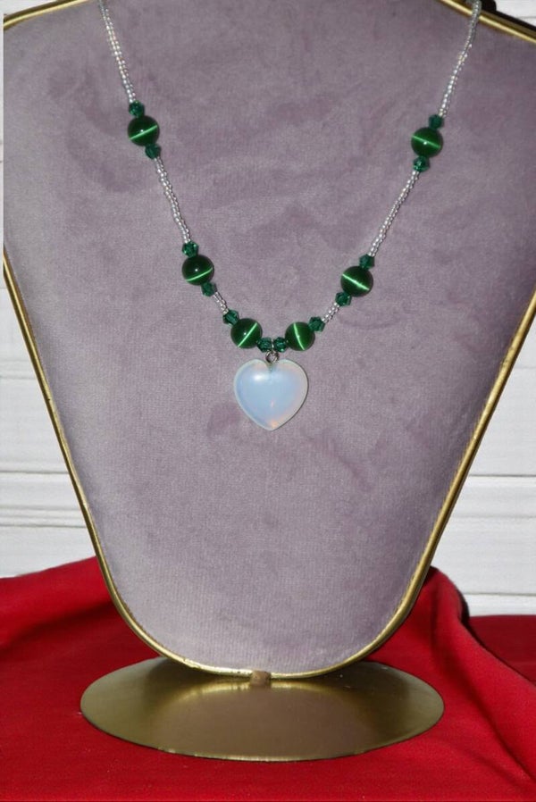 Collier 43 cm + extension "Coeur en opalite" composé de perles de rocaille, oeil de chat et cristal. Pendentif en opalite. Acier inoxydable