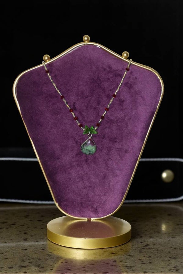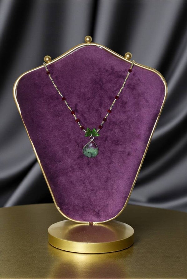 Collier 45 cm + extension "Fuschite" composé de perles verre, cristal et rocaille. Pendentif métal en fuschite. Acier inoxydable.